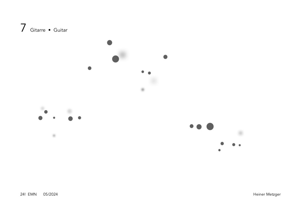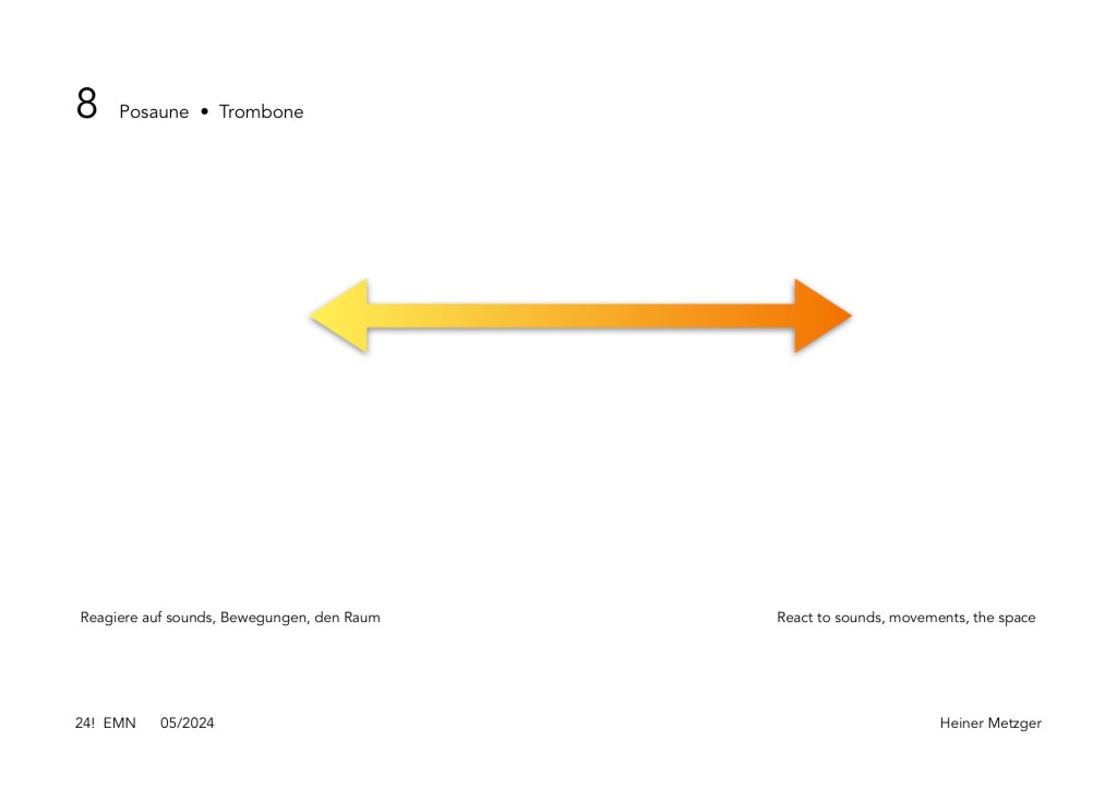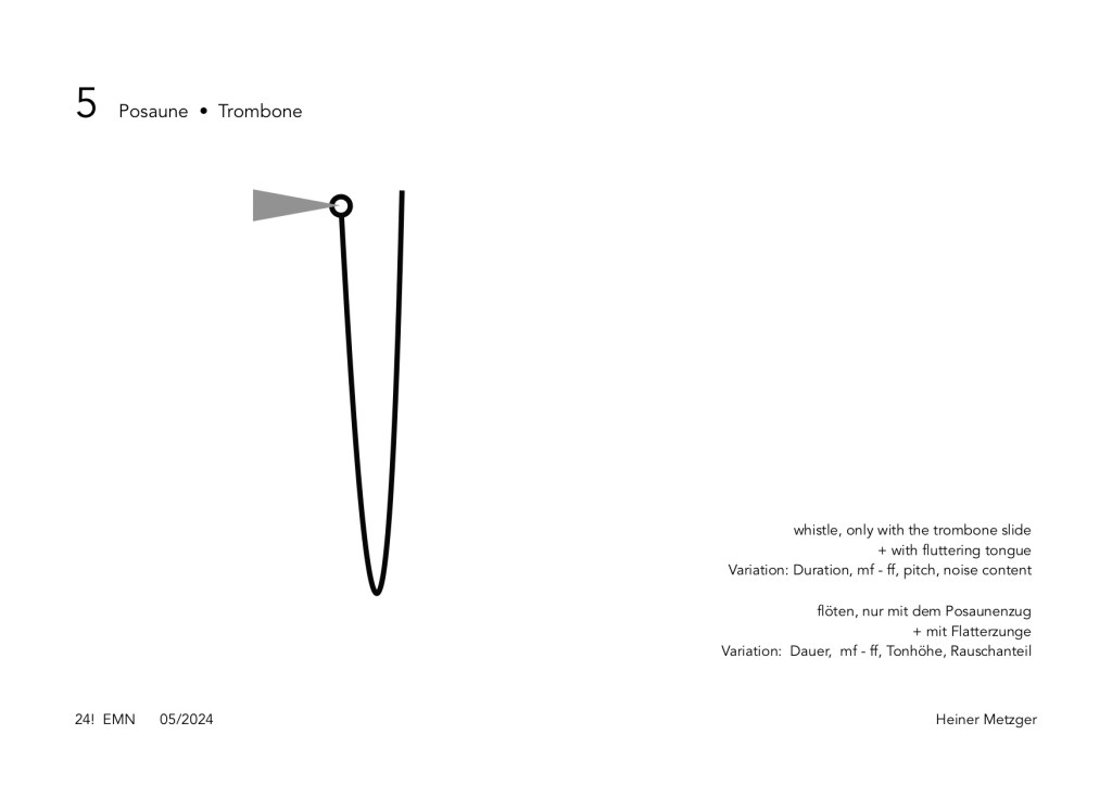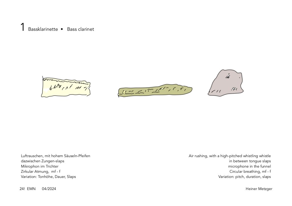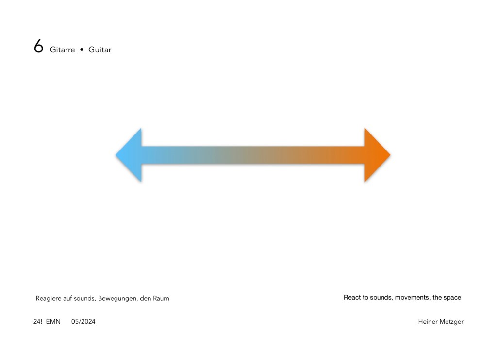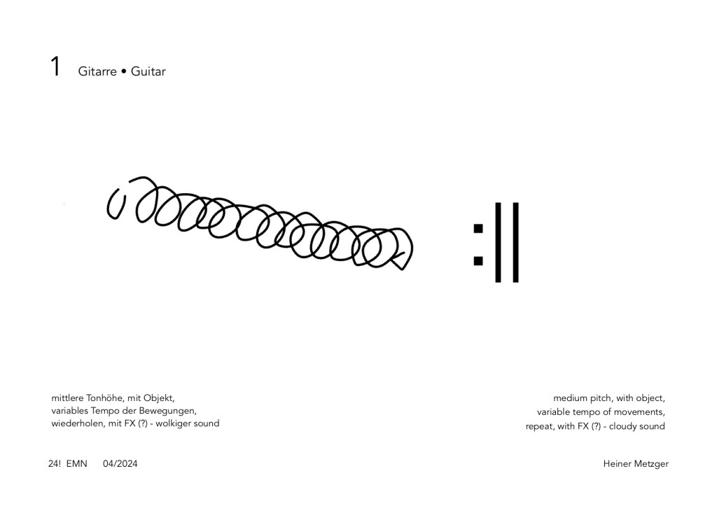At the first interpretation of the EMN Trio with Christoph Funabashi: guitar, objects, Felix Mayer: trombone, Heiner Metzger: clarinets, objects on June 15, 2024, a playing time of around one minute per sheet was agreed upon, the order was random. The interpretation took about 12 minutes.